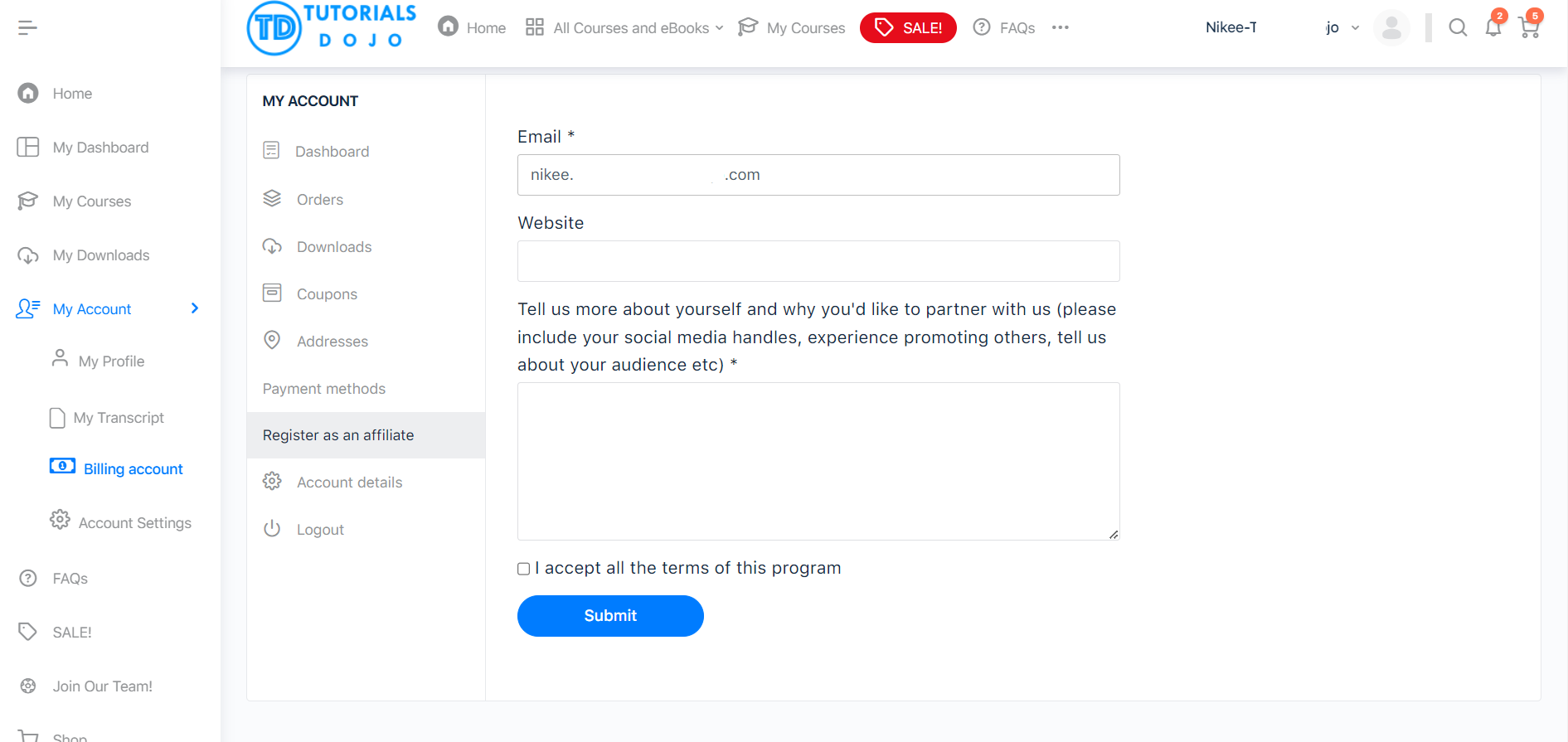 Under the My Account, select Register as an Affiliate. After clicking, registration for the Affiliate form will show. Fill out the required information in the registration form, including your name, email address, and other necessary details.