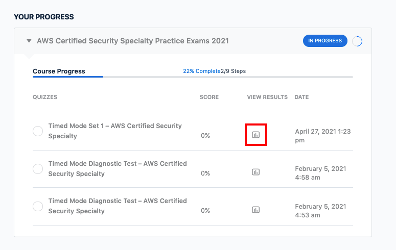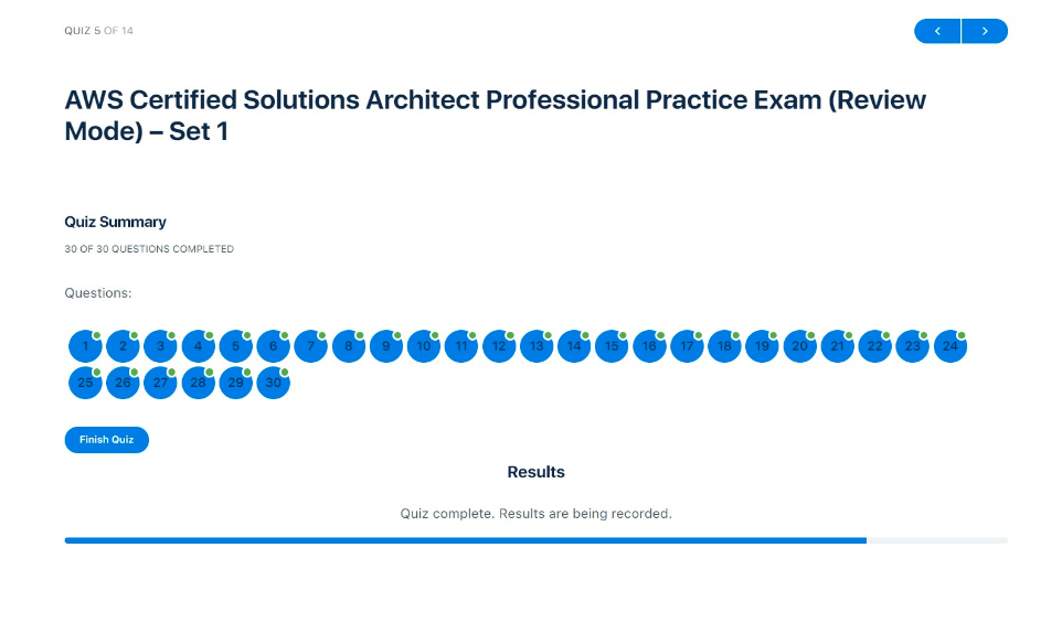 The Final Test mode can’t save the exam progress since we are trying to simulate the actual AWS exam environment. Any interruption or session expiry during the practice exam will force you to retake the test, just like in a real-world AWS exam. If you were answering a set from the Timed Mode or Review Mode, then you can resume the test at a later time.