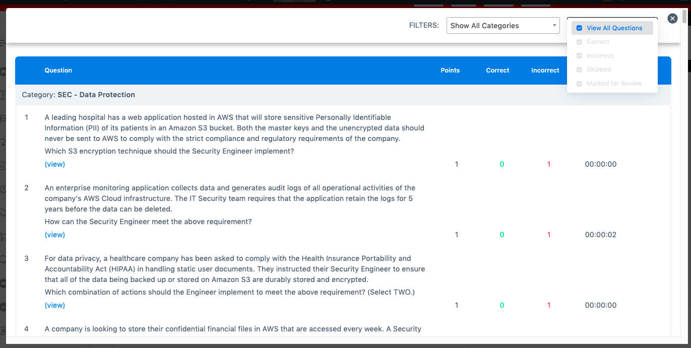 In this view, you can filter your results by category and by correct/skipped/incorrect answers/marked for review.