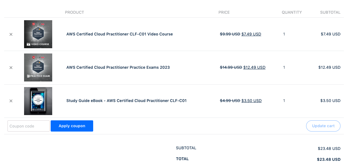 Absolutely! The individual product price of each eBook ranges from $4.99 USD (for Cloud Practitioner) to $6.99 USD (for all the other AWS certifications) but if you get our practice test courses at the same time in one transaction, you can get them at discounted bundle prices.