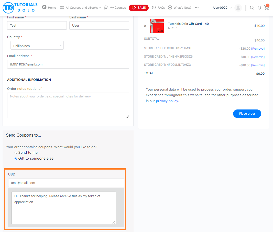 After completing the billing section, you will come across an additional section called Send Coupon to. In this section, choose the option Gift to someone else to send the purchased Gift Card/Store Credit to your friend. Enter your friend’s details such as email where you would like the Gift Card/Store Credit to be sent. Additionally, you have the option to include a personal message. Ensure you provide accurate information to ensure the gift card is sent to the correct recipient.