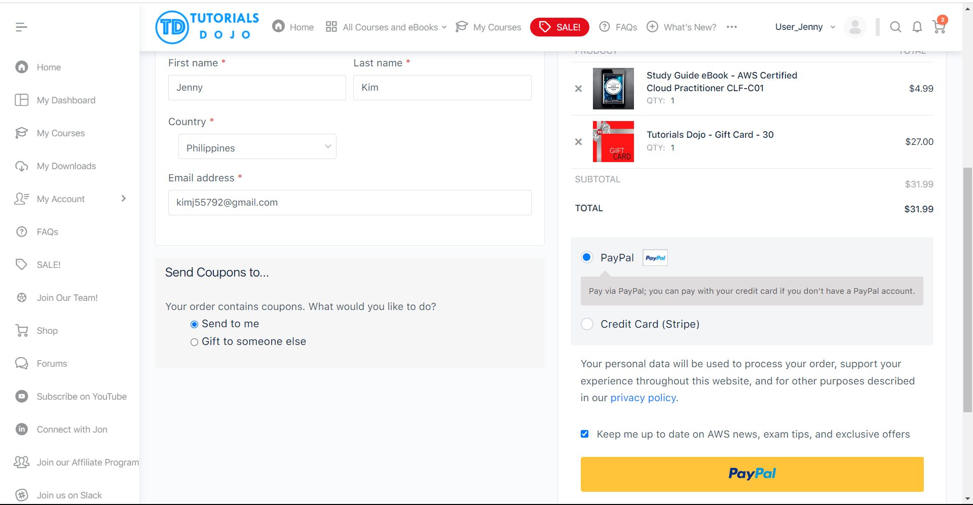 After filling out the billing section, you will notice an additional section labeled Send Coupon to. Within this section, just leave the default option Send to me.
