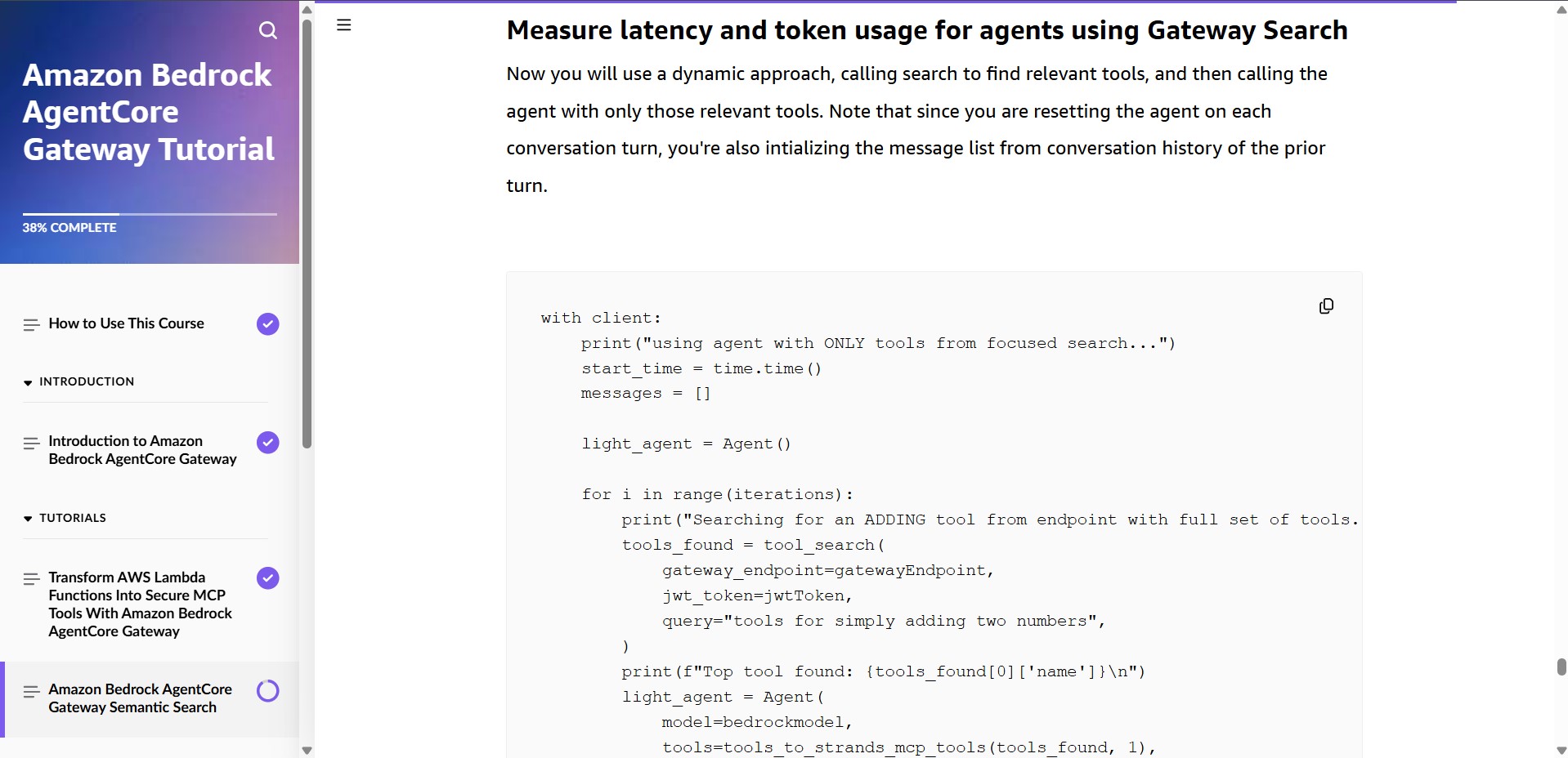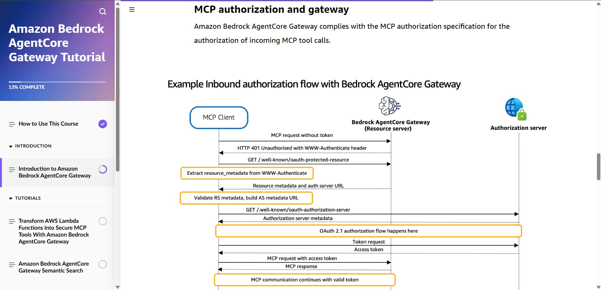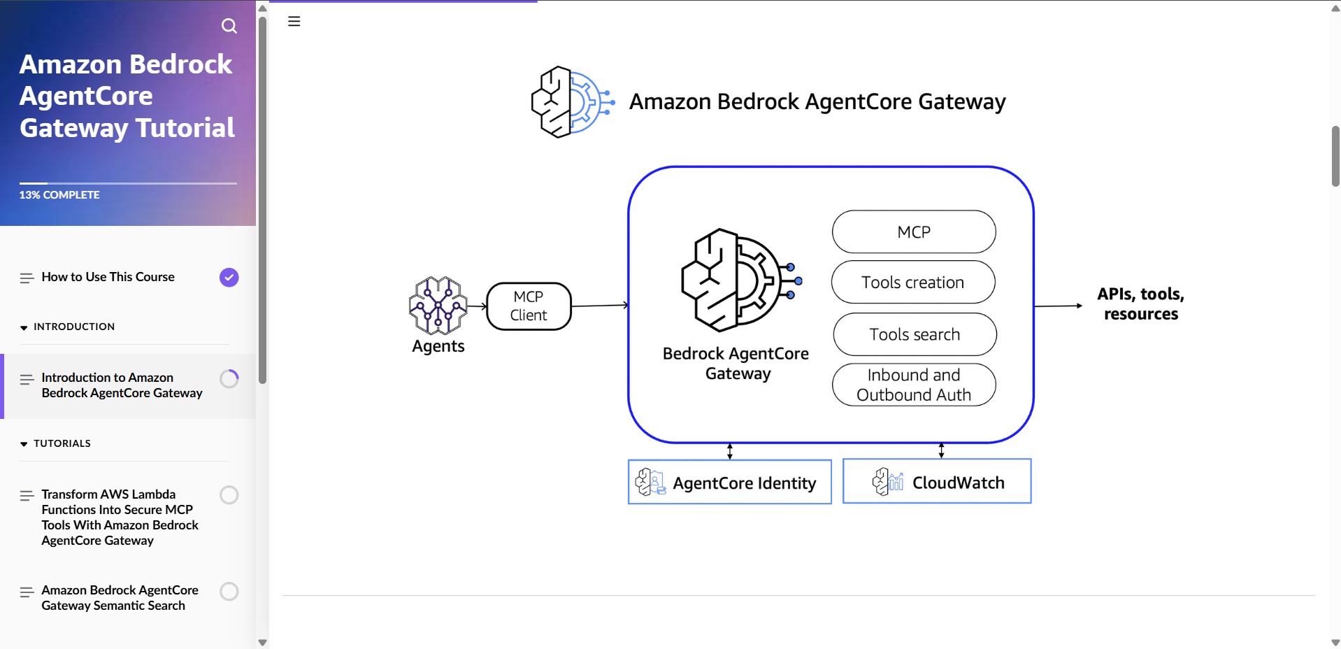 Amazon Bedrock AgentCore Gateway provides customers a way to turn their existing APIs and Lambda functions into fully-managed MCP servers without needing to manage infra or hosting. In this course you will follow a series of tutorials to learn how to use Amazon Bedrock AgentCore Gateway.