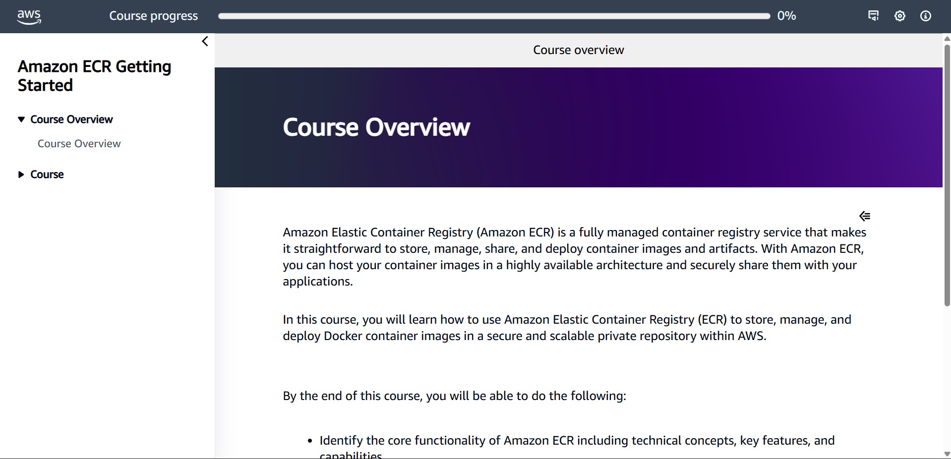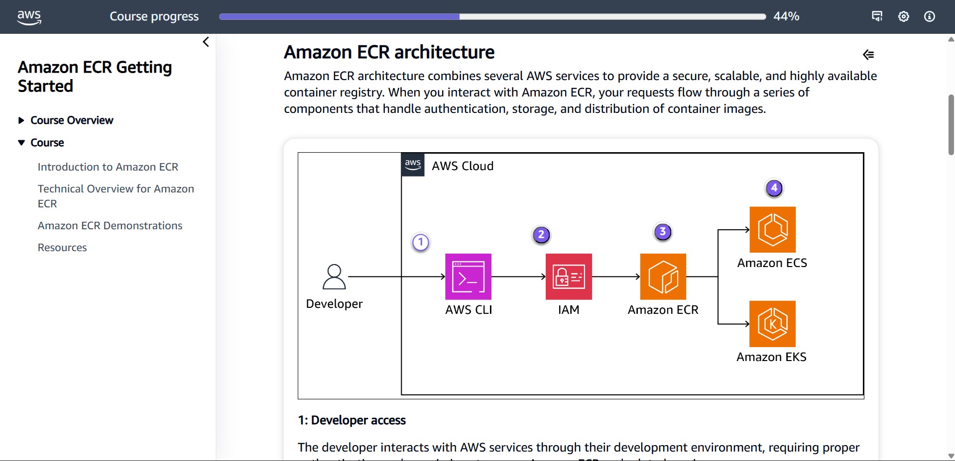 This module introduces Amazon Elastic Container Registry (Amazon ECR), a fully managed Docker container registry service that makes it easy for developers to store, manage, and deploy Docker container images. Learn about the core functionality, technical concepts, key features, and practical business applications of Amazon ECR. The module covers Amazon ECR architecture, integrations with AWS services, security features, and common use cases.