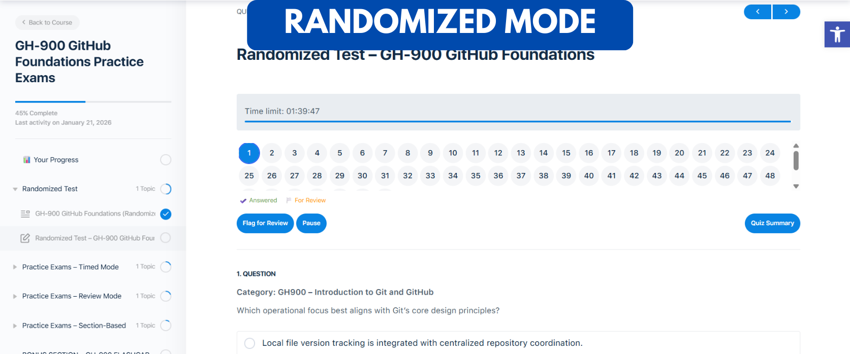 - RANDOMIZE TEST MODE – Randomly generates GH-900-style exam questions from the complete question bank to simulate real exam conditions.