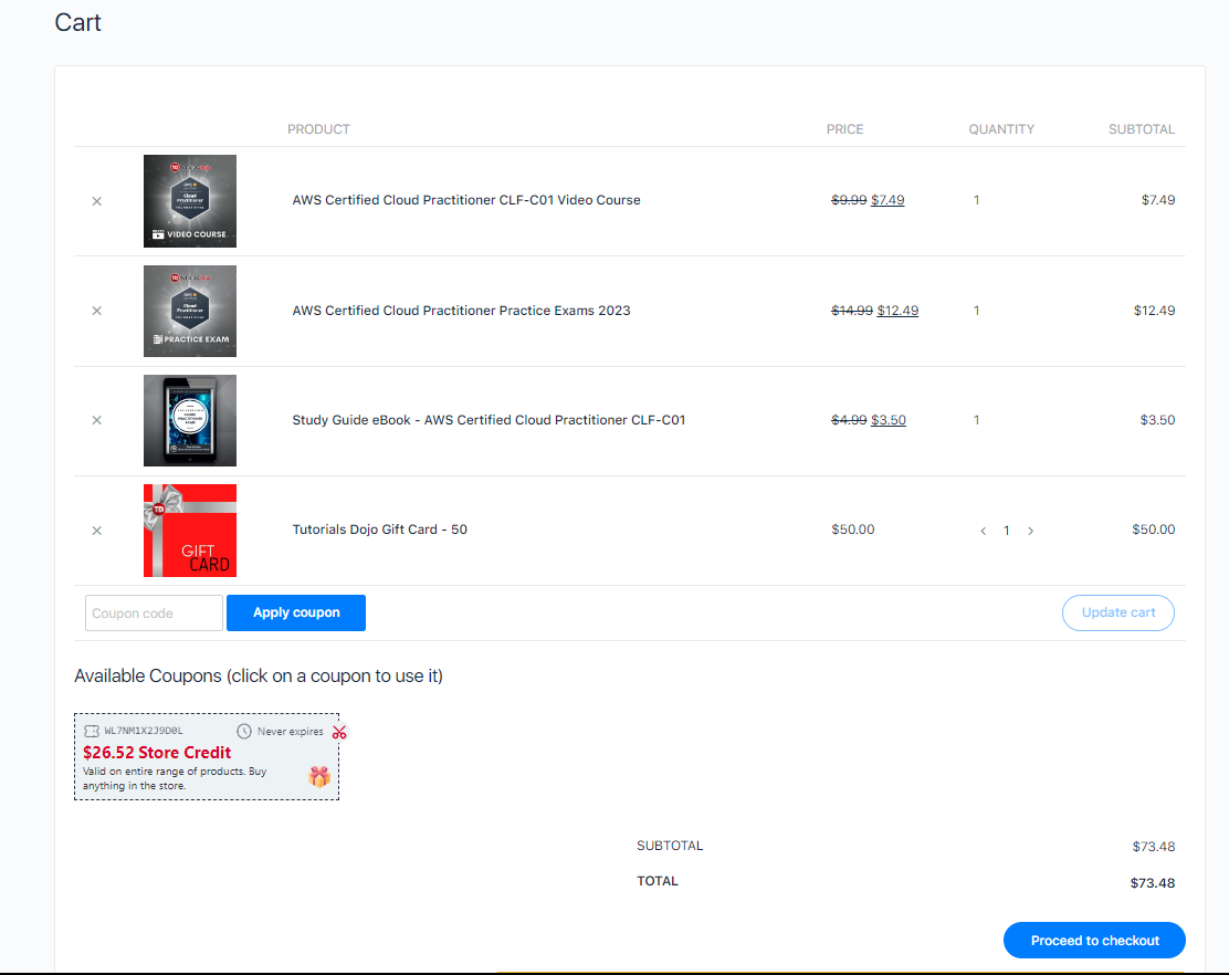 If you have a valid coupon code, enter it in the provided field or if you have store credits available in your account, just simply select the available credit/coupon and click Proceed to Checkout.